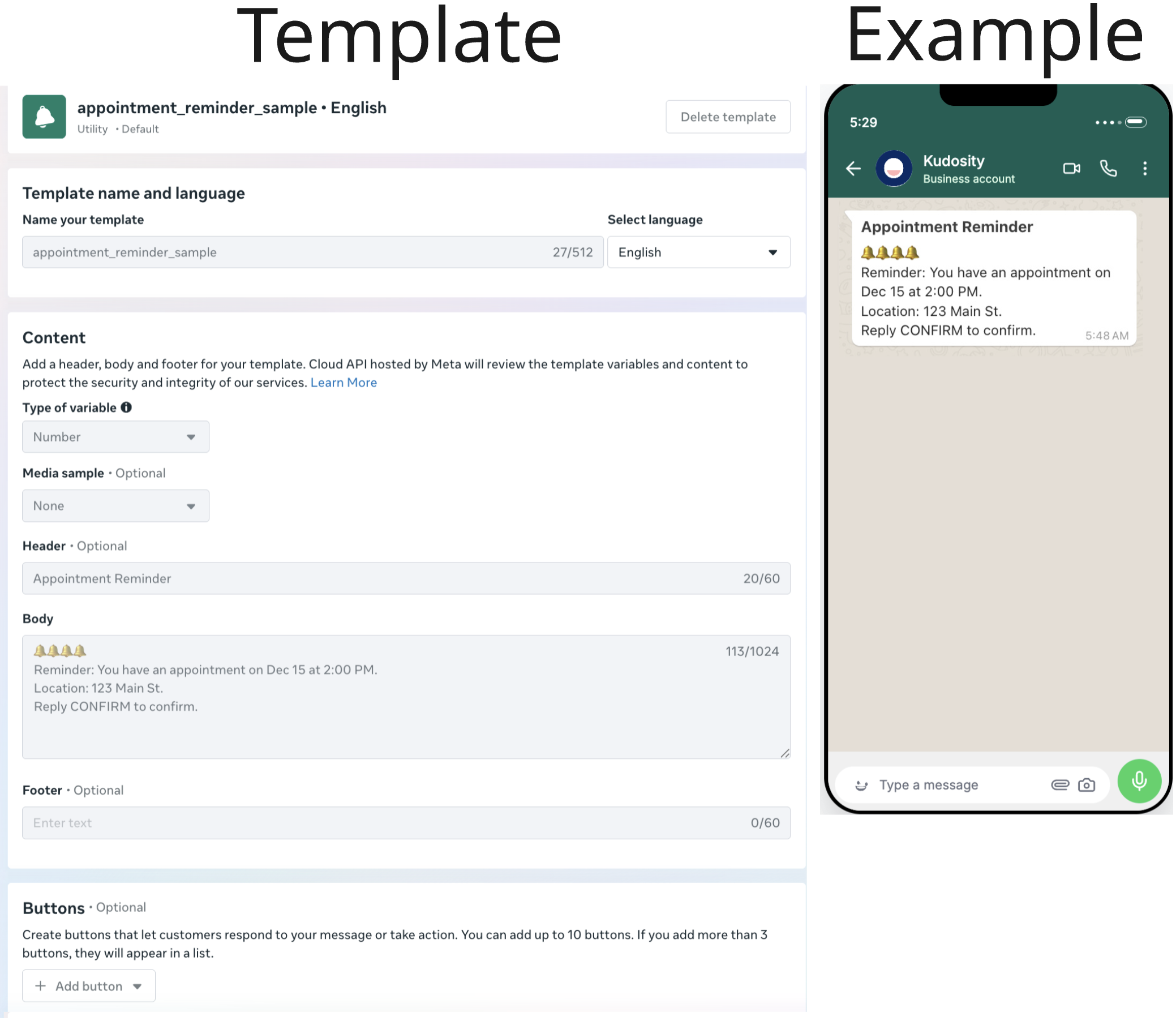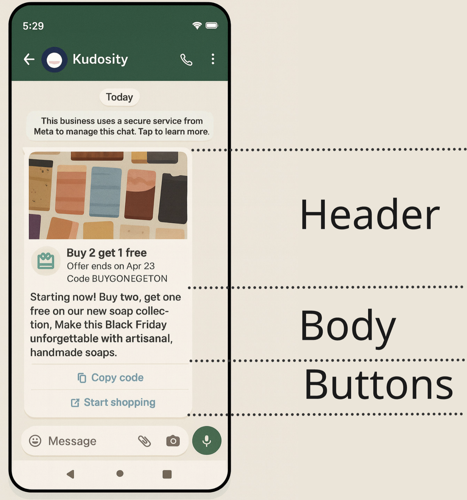 This visual shows the standard layout of a WhatsApp template message as it appears to the end user. It helps developers understand where template components render and how they map to template structure.