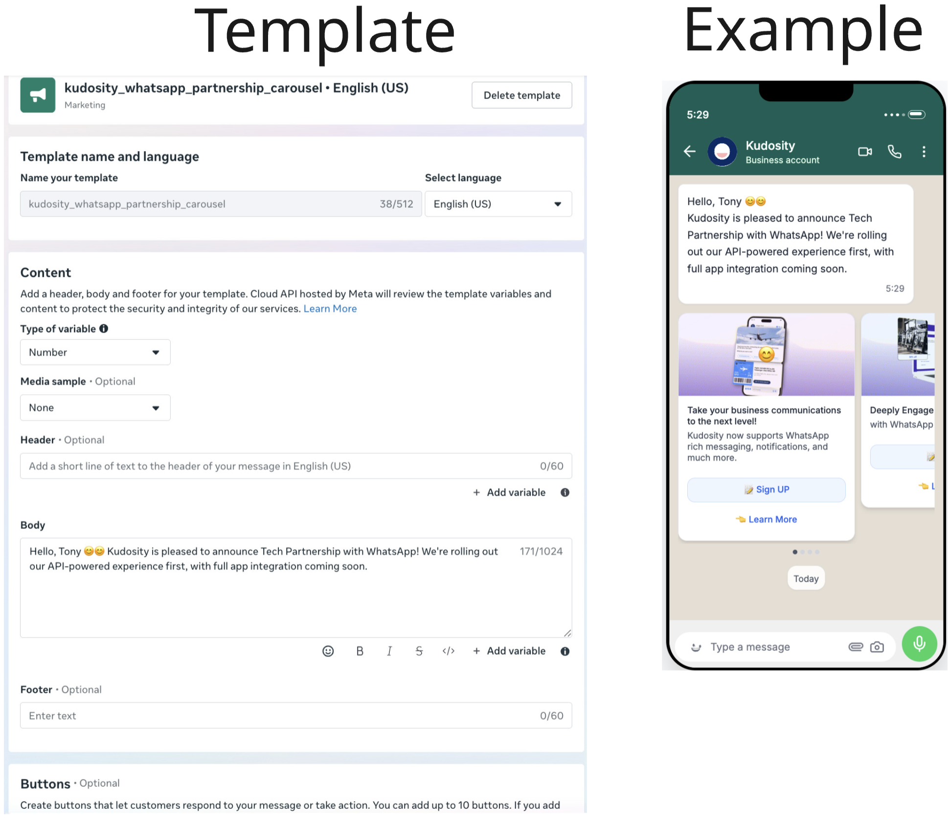 | Marketing | custom | Yes | Yes (images, video, documents, carousels) | Used for promotional outbound messaging |